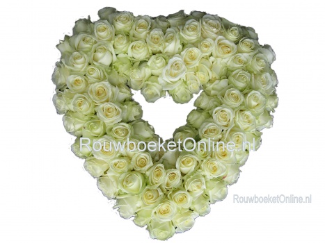 Door de wisselende samenstelling van ons assortiment kan het zijn dat de roos uit het getoonde rouwhart iets kan afwijkt met wat op de afbeelding staat.